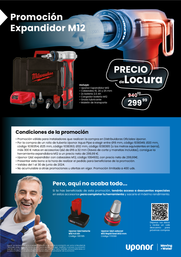Si quieres conseguir este super precio, compra un rollo de tubería Uponor Aqua Pipe a elegir entre Ø16 mm, código 1038349; Ø20 mm, código 1038354; Ø25 mm, código 1038363; Ø32 mm, código 1038365 (o los metros equivalentes en barra), más 300 € netos en accesorios Q&E de Ø16 a 32 mm (llaves de corte y manetas incluidas), consigue la herramienta expandidora M12 a un precio neto de 299,99 €.